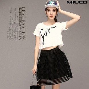 2015夏款女裝新款時尚字母短款T恤+竹節織花蓬蓬半身裙套潮 /