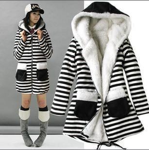 2015秋冬裝韓版時尚女裝經典連帽可愛條紋長袖羊羔絨外套 /