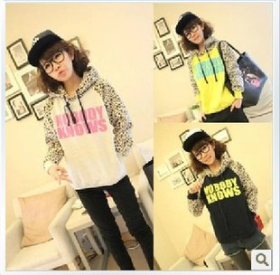 2015春秋新款豹紋拼色寬松連帽休閑長袖衛衣套頭小外套女批發 /