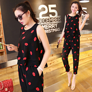 大量現(xiàn)貨廠家價2015夏季女裝時尚大碼紅唇無袖雪紡休閑長褲套裝 /