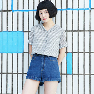 2015夏季新款復古高腰顯瘦牛仔短褲2色入 /