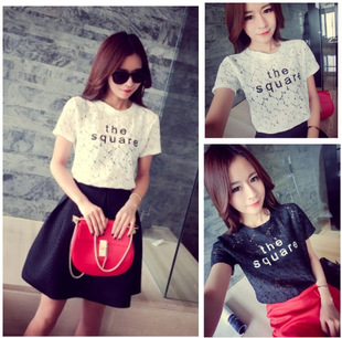 2015 春夏裝韓國新款時尚潮流百搭勾花鏤空蕾絲T恤女 /