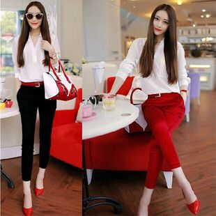 簡介: 貨號 GD321 6757 產地 廣州 主圖來源 官方圖片 貨源類別 現貨 是否庫存 是 風格 休閑 圖案 純色 面料 雪紡/喬其紗 款式 褲套裝 上衣款式 雪紡衫 上衣袖長 長袖 褲款式 鉛筆褲 褲長 九分褲 流行元素 拼接 工藝 印花/印染 上市年份/季節 2015夏季 顏色 黑色套裝優質版【今日送腰帶】,紅色套裝優質版【今日送腰帶】 尺碼 S,M,L,XL