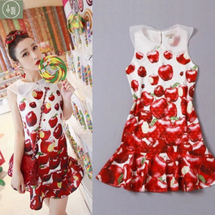 小雅家 歐洲站新款菁菁同款小清新紅蘋果印花修身魚尾連衣裙女 /