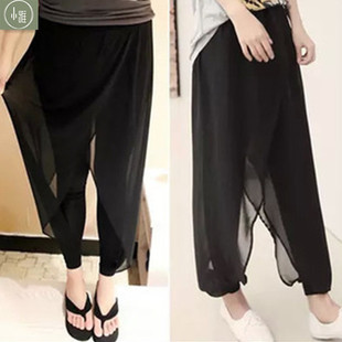 小雅家 超顯瘦 胖MM可穿寬松雪紡拼接松緊腰小腳哈倫褲長褲夏 /