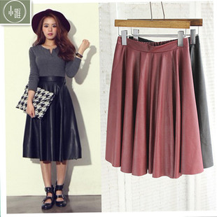 小雅家韓國東大門新款復古高腰PU皮半身裙顯瘦百褶皮裙大擺裙 /