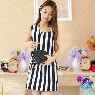 【模特實拍】2014秋冬款時尚氣質黑白條紋無袖連衣裙 /
