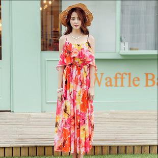 2015新款女裝 波西米亞長裙雪紡度假連衣裙露肩印花沙灘裙 高品質 /