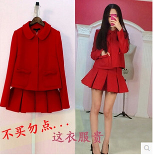歐洲站娃娃領羊毛呢套裝裙兩件套冬 蝴蝶結紅色毛呢大衣套裝女裝 /