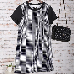 休閑短袖格子連衣裙 2015歐洲站高端女裝拼接圓領大碼顯瘦連衣裙 /