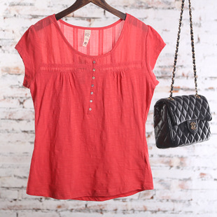歐洲站日系全棉短袖T恤 高檔品質外貿女裝圓領紐扣裝飾女士T恤衫 /