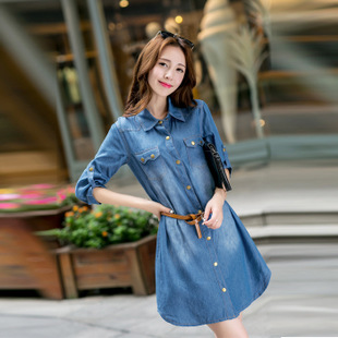 實拍2015春秋款原創韓版時尚加大碼胖MM七分袖牛仔連衣裙女 /