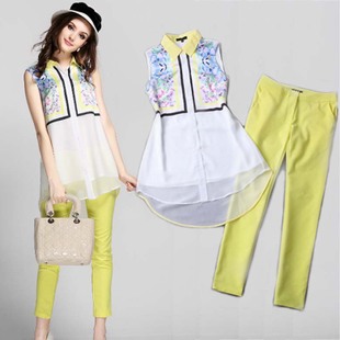 2015夏歐洲站唯一高端正品女裝清爽印花無袖長款襯衫+打底褲套裝 /