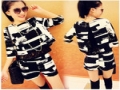 2015韓版抽象黑白印花后背開叉蕾絲拼接七分袖上衣短褲套裝8114# /