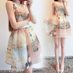 歐洲站夏裝新款韓版歐根紗印花短裙背心裙時尚名媛連衣裙女8226# /