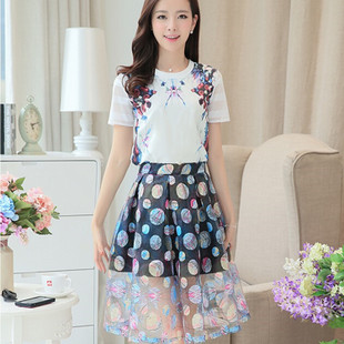 夏季新款韓版歐根紗兩件套裝裙蓬蓬裙刺繡印花修身短袖雪紡連衣裙 /