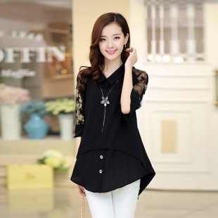 廠價直銷----2015韓版寬松女式大碼胖MM襯衣領網紗拼接雪紡衫 /