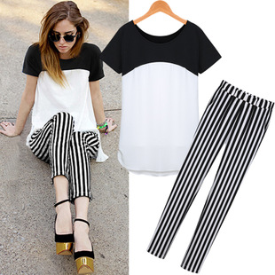 廠價直銷---2015夏裝大碼女裝 胖MM 寬松顯瘦棉T條紋褲 套裝 /