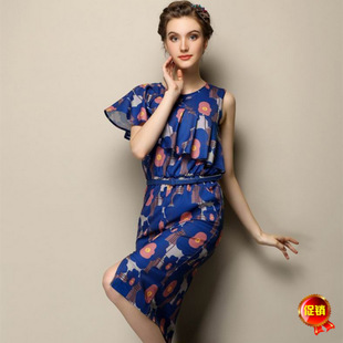 2015歐洲站夏季新款荷葉邊開衩修身印花背心連衣裙女 /
