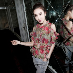 2015歐洲站夏裝新款時尚露肩印花女t恤短袖收腰打底衫女 /
