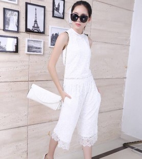 歐洲站2015夏新款名媛氣質(zhì)七分闊腿褲兩件套 蕾絲時尚套裝 /