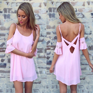 歐美外貿爆款新款粉色喇叭袖性感吊帶露背雪紡短袖連衣裙速賣通 /