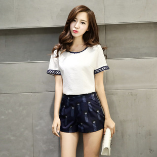 韓版修身短褲套裝女夏季2015夏裝新款女裝短袖印花棉麻兩件套 /