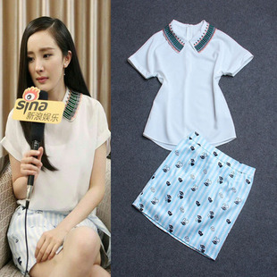 2015新款明星楊冪同款繡鉛筆頭娃娃領(lǐng)短袖上衣+印花半裙套裝 /