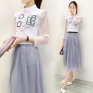歐洲站2015夏季時尚套裝連衣裙小香風歐根紗袖刺繡圖案兩件套女裙 /