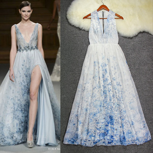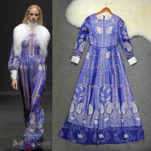 歐洲站 2015 春夏服裝免費代理加盟 V藍花真絲超長波西米亞連衣裙 /