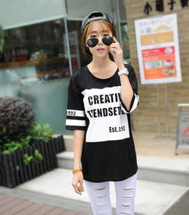 • 批發(fā)供應(yīng)韓版2015純棉英文身袖印花女中長(zhǎng)款圓領(lǐng)中袖T恤一件起批 /