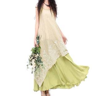 代發阿卡同款套裝大碼顯瘦女裝假兩件田園棉麻連衣裙不規則長裙 /