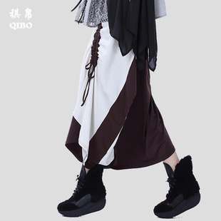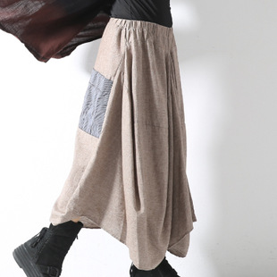 不規則拼接哈倫褲長裙寬松大碼女裝抽褶亞麻休閑褶皺裙棉麻半身裙 /