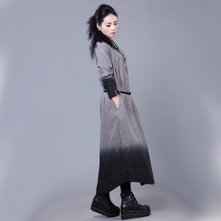 單排扣V領漸變色長袖連衣裙寬松女裝文藝森女棉麻布衣民族風裙子 /