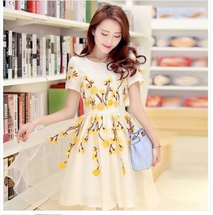 新款氣質 青花瓷刺繡歐根紗蕾絲韓版短袖雪紡裙 /