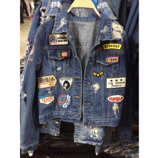 2015韓國春裝女裝韓版原宿徽章貼布水洗破洞牛仔夾克外套女 /