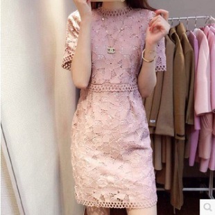 2015新款春夏女裝韓國修身顯瘦蕾絲裙子粉色鏤空圓領連衣裙淑女 /