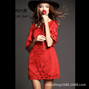 歐洲站2015早春新款女裝 明星同款紅色繡花鏤空連衣裙一件代發 /