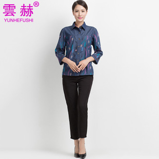 專注中老年女裝牛仔印花襯衫七分袖全棉襯衫媽媽裝廠家低價熱賣 /