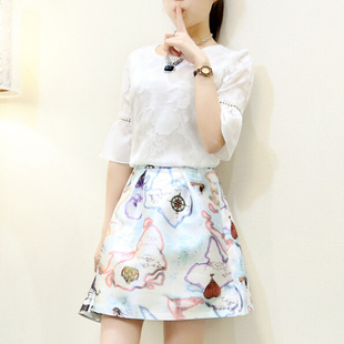 2015夏新款女裝兩件套高腰連衣裙水溶喇叭袖圓領套裝蓬蓬a字裙女 /