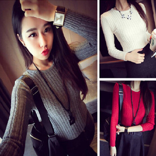 3083# 2015秋冬新款簡約百搭麻花針織修身顯瘦圓領打底針織衫 /