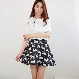 小清新韓國刺繡貓咪套裝顯瘦蓬蓬裙連衣裙 夏季短裙 兩件套裝女 /