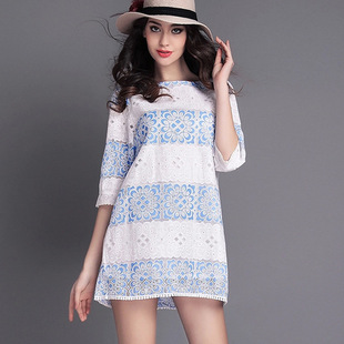 歐洲站 2015夏季女裝新款七分袖蕾絲印花鏤空名族風女式連衣裙 /