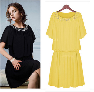 歐洲站 2015夏季新款大碼女裝短袖蝙蝠袖燙鉆女士雪紡連衣裙 夏季 /