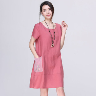 2015夏裝新款女裝布衣寬松顯瘦大口袋韓版圓領短袖棉麻連衣裙 /
