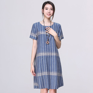 2015夏裝新款文藝原創(chuàng)女裝圓領大碼寬松顯瘦條紋棉麻連衣裙長裙 /