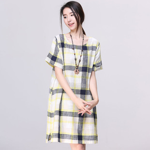 2015夏季新款連衣裙韓版寬松大碼休閑經(jīng)典格子棉麻短袖連衣裙夏 /