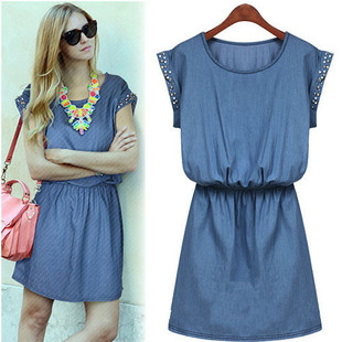 蝶戀花蝶戀花夏裝女裝歐美牛仔短袖大碼女連衣裙寬松釘珠顯瘦長裙 /