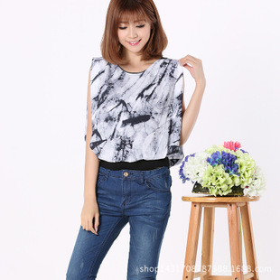 女裝夏季T恤無袖雪紡衫 水墨畫短腰甜美無袖T恤KY523 /