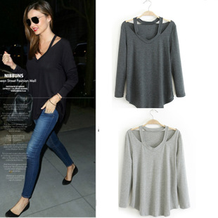 2014外貿新款歐美時尚休閑女裝春夏露肩長袖V領上衣女式T恤3106 /
